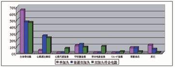 圖2 從2001年7月-2002年6月調(diào)研10家單探頭用戶、5家普通雙探頭用戶和30家雙探頭可變角度帶有符合電路用戶臨床檢查類型的數(shù)據(jù)。為了便于比較,采用相對數(shù)的方法?梢钥闯鰧τ趩翁筋^用戶在臨床主要用于骨掃描和甲狀腺檢查。對于雙探頭帶有符合電路系統(tǒng)的用戶,骨掃描46%、心肌血流灌注23%、符合電路10%、甲狀腺9%、心肌代謝7%、GA-67為2%,其它(腎臟、肝等)3%?梢钥闯鲭p探頭符合電路系統(tǒng)最大的貢獻是為臨床開拓出20%新的檢查項目,最為重要的是這些檢查項目將成為主流臨床檢查。這可能是雙探頭(多探頭)符合電路在國內(nèi)急劇增加的主要原因。