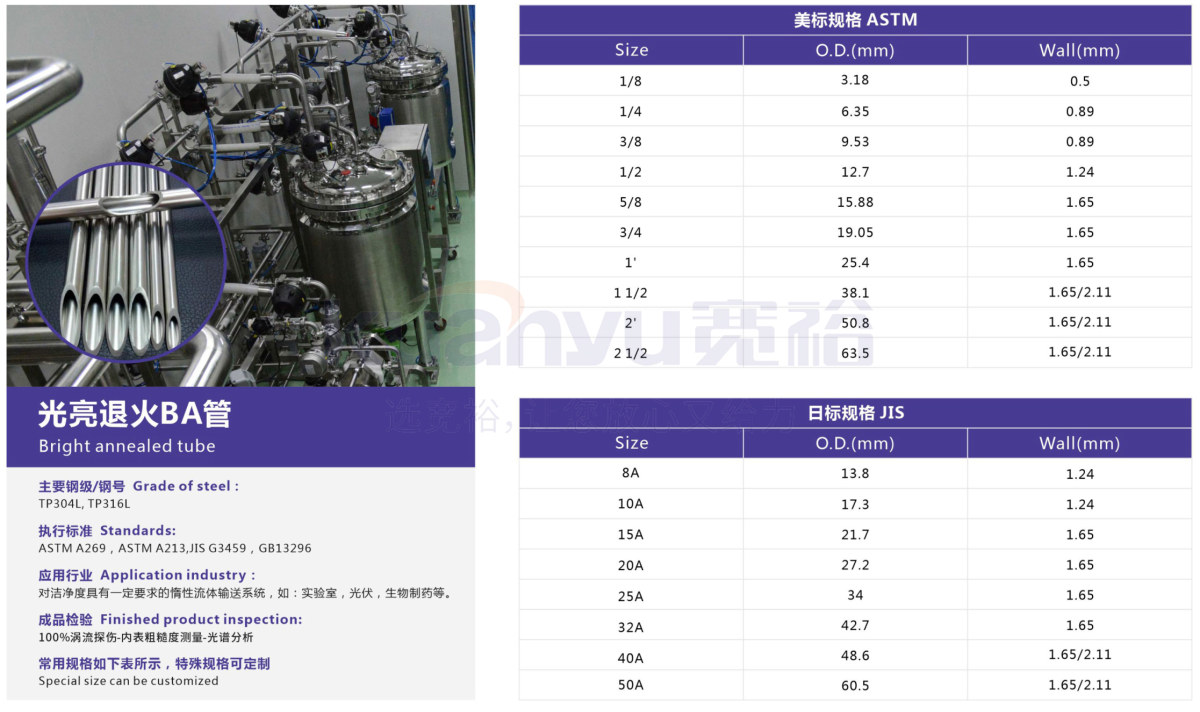 不銹鋼衛(wèi)生級管主要應(yīng)用于食品,飲料,酒類,生物工程等生產(chǎn)設(shè)備及流水線。主要是針對不銹鋼管的表面光潔度,禁油度以及鈍化層進(jìn)行要求。