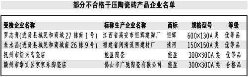 本報(bào)訊記者龔漢斌報(bào)道:近日,江西省質(zhì)監(jiān)局公布了近期對(duì)干壓陶瓷磚產(chǎn)品進(jìn)行省級(jí)產(chǎn)品質(zhì)量監(jiān)督抽查的結(jié)果。質(zhì)監(jiān)部門共抽查了51家生產(chǎn)企業(yè)生產(chǎn)的52批次產(chǎn)品,抽樣合格率90.4%。抽查結(jié)果表明,本次抽查的陶瓷磚其放射性核素限量指標(biāo)均達(dá)到了標(biāo)準(zhǔn)規(guī)定的要求;但仍有部分產(chǎn)品存在一些問(wèn)題。