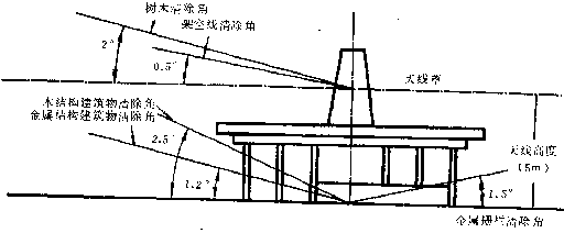 5.7.1 以天線為中心,半徑200 m以內(nèi)不得有建筑物(機(jī)房除外);半徑200 m以外,金屬結(jié)構(gòu)建筑物的高度不應(yīng)超過以天線基礎(chǔ)為準(zhǔn)1.2o垂直張角,木質(zhì)結(jié)構(gòu)建筑物的高度不應(yīng)超過以天線基礎(chǔ)為準(zhǔn)2.5o垂直張角。