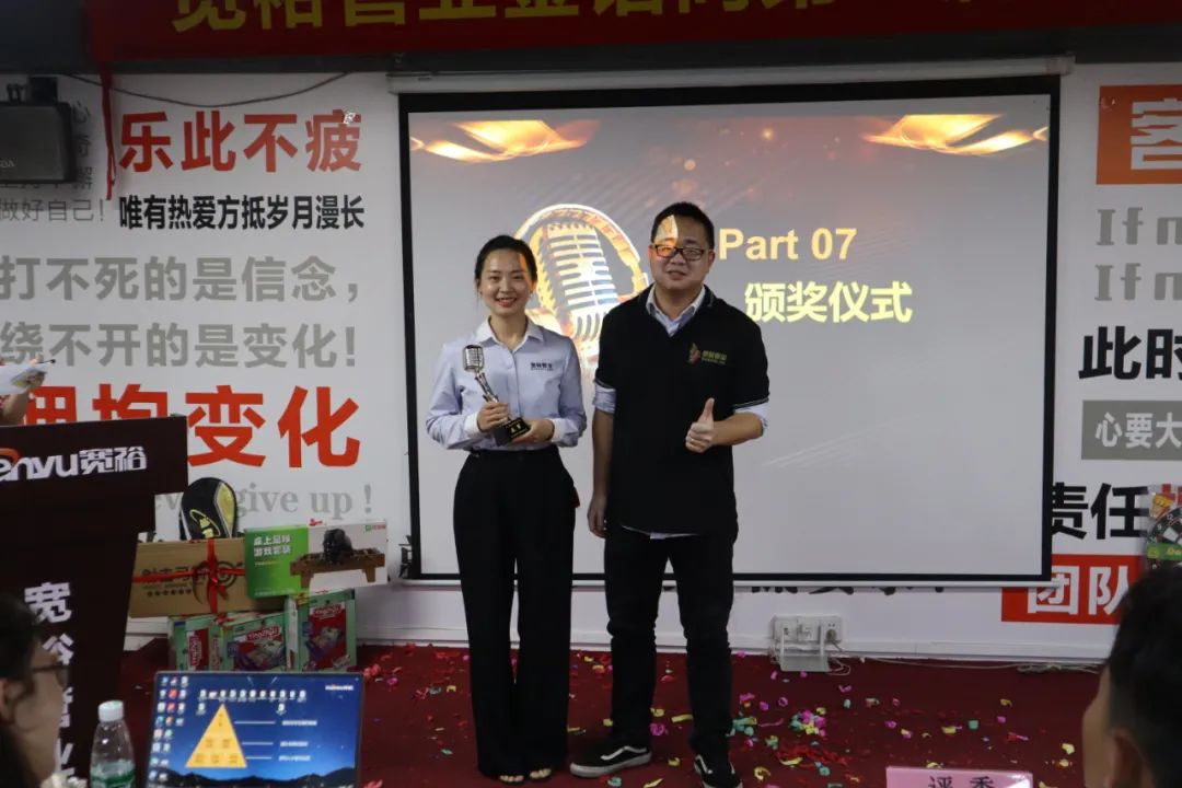 經(jīng)過2.5小時(shí)的激勵(lì)角逐,在15名參賽選手中,最終決出了本次金話筒比賽的冠亞季軍,他們分別是網(wǎng)絡(luò)運(yùn)營(yíng)部的陳森(冠軍)、創(chuàng)美佳的銷售工程師單香君(亞軍)、無敵隊(duì)的銷售工程師陳加欣(季軍)。卓越啦啦隊(duì)則由呼聲最高的無敵隊(duì)獲得!