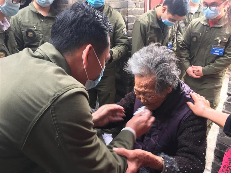 ▲突擊隊(duì)的武一為婆婆擦眼淚。婆婆有3個(gè)女兒1個(gè)兒子,可是她卻只有一個(gè)人住在一間已經(jīng)破敗不堪的小房子里,里面?zhèn)鱽黻囮嚨膼撼簟K^發(fā)很長,腿有撞傷流血而未清除的淤血。她一直對我們說感謝,動情處熱淚凝眶,見者無不動容!與物質(zhì)相比,更多的老人家們更需要的是親人,子女的陪伴和關(guān)愛!一直崇尚以孝為先的社會,原來依然有那么多不為人知的“隱秘的角落”!