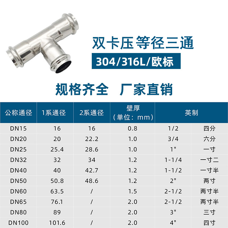 不銹鋼水管雙卡壓等徑三通管件,304 316L不銹鋼材質(zhì),DN15-DN100通徑。本不銹鋼水管雙卡壓等徑三通管件符合國標(biāo)I系,國標(biāo)II系,歐標(biāo)。